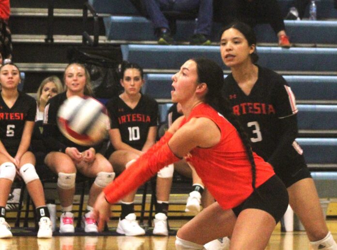 Artesia’s Avery Fredrick goes up on a kill shot against Ruidoso’s Morgan Eidson, Tuesday night. Artesia defeated the Lady Warriors 25-19, 25-19 and 25-10. Todd Fuqua Artesia Daily Press Artesia’s Brecklyn Miller gets a dig in against Ruidoso in a…