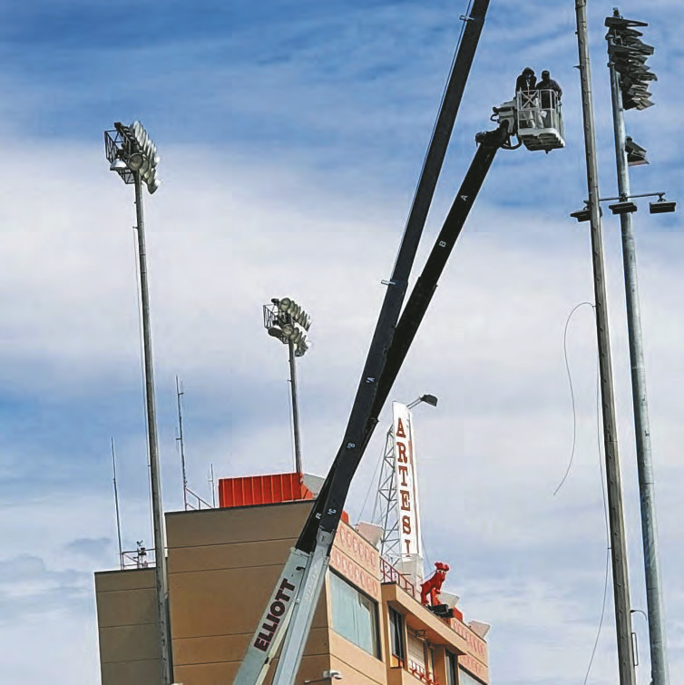 Bulldog Bowl has been undergoing a few upgrades in preparation for the 2024 season. At left, crews work to replace the stadium’s light fixtures with…
