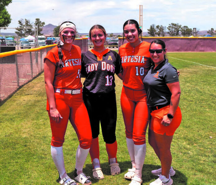 Artesia was represented Saturday at the Red, Green, Gold and Turquoise All-Star Softball games in Las Cruces by, from left, Mikenzi Carlo, Zowe Warren, Madison Martinez and Lady Bulldog head coach Sandra Pulido. Morning games in the all-classifications round robin…