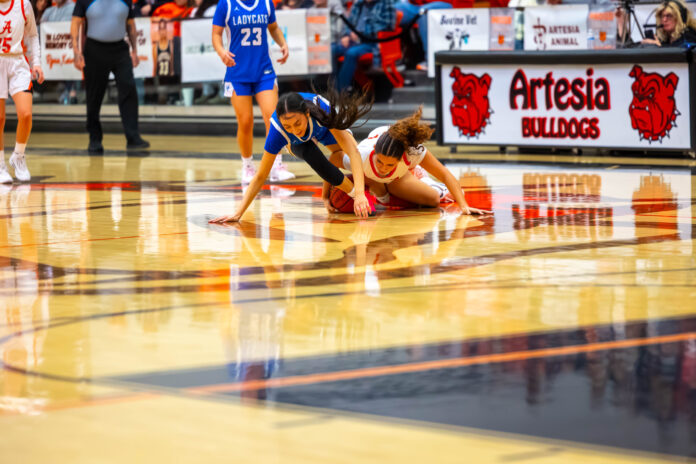 Artesia guard Jordon Rone let a 3-point shot go against Lovington at the Pit on Friday night. Jordan Rone lets the shot fly against Lovington on Friday night at the Pit. Brooklyne Fuentes shoots a free throw against Lovington during…