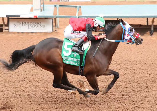 RUIDOSO DOWNS -- The Marksman V and jockey Francisco Calderon broke sharply and led throughout the $829,372 Ruidoso Derby for 3-year-old quarter horses at Ruidoso Downs Race Track Saturday, scoring a length-and-three-quarters victory for owner Sammy Valeriano and trainer Heath Taylor. “My horse broke like a rocket,” Calderon said. “We were out front and in the last hundred yards he drifted but ran so smoothly. He was super impressive today.” The Marksman V ran the 400 yards in a time of 19.462 seconds and paid $16, $8.20 and $4.80. The gelding is a home-bred sired by Apollitical Jess out of the mare Bellissima Chocolata by Valiant Hero. It’s the first stakes victory for The Marksman V, having run second in the Texas Classic Juvenile at Lone Star Park as a 2-year-old last November to Flying Rabit 123; that gelding won the $100,000 Ruidoso Invitational Stakes Saturday. “The Marksman V is paid up in the Rainbow Derby and if he comes back sound that will be our next venture,” Taylor said after the race. Flying Rabbit 123 and jockey Juan Pulido won the Ruidoso Inviational by three-quarters of a length, covering the 400 yards in 19.956 seconds and paying $5, $3.20 and $2.40. The gelding is sired by Flying Cowboy 123 out of the mare Hardtoget by Foose. Racing continues at Ruidoso Downs today with the running of the $1-million Ruidoso Futurity. Post time is 1 p.m.