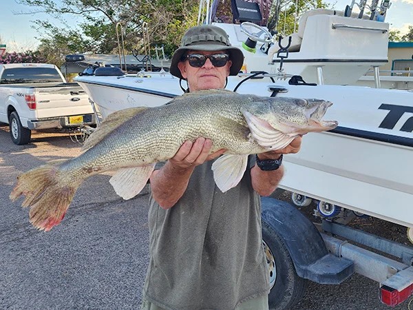 Billy Jack Miller caught a walleye on his first cast using a 4-inch green speckled curly-tailed grub below Elephant Butte Lake and Caballo Lake on June 2, 2025.