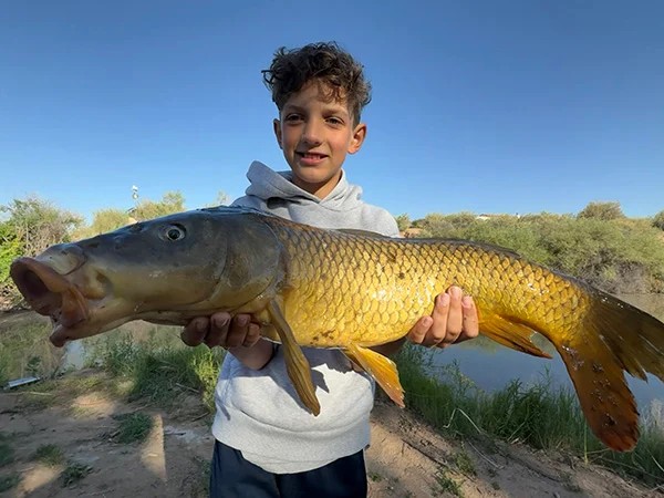 Sam Teston caught this giant carp using corn after a hard, five-minute battle on May 26, 2025 at Albuquerque Area Drains. It was his first fish – and it came on the morning of his 10th birthday.