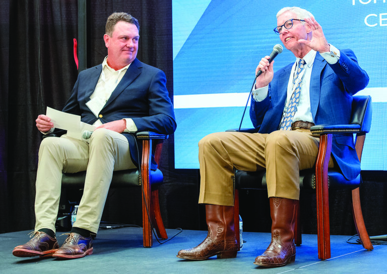 Tom Jorden, Coterie Energy CEO, right, talks during a “fireside chat” with moderator Finn Smith, during the luncheon keynote address at the 2025 EnergyPlex Conference on Tuesday at the Lea County Event Center in Hobbs.Andy Brosig/News-Sun