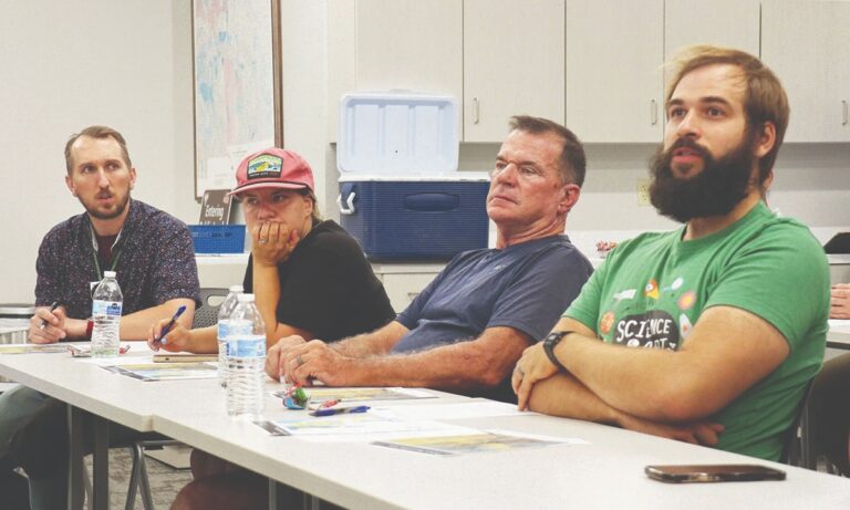 Daniel Cederburg, on the far right, co-owner of Moon Rock Outfitters, an adventure and bicycle shop in downtown Roswell, is shown asking a question about plans for the Bureau of Land Management’s Pecos River Oxbow land acquisition east of Roswell on Aug. 18 during a public meeting about the site.Terri Harber | Roswell Daily Record