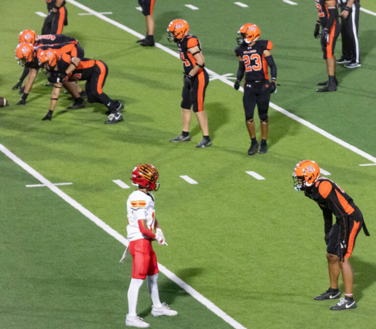JT Keith | Artesia Daily PressArtesia cornerback Tootie McNeil lines up against a Centennial wide receiver. Artesia would lose to 6A Centennial Hawks 42-38 at the Bulldog Bowl on Friday night.